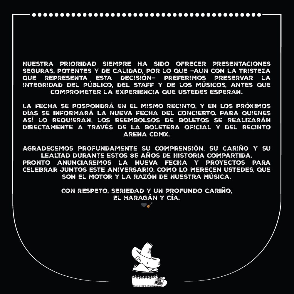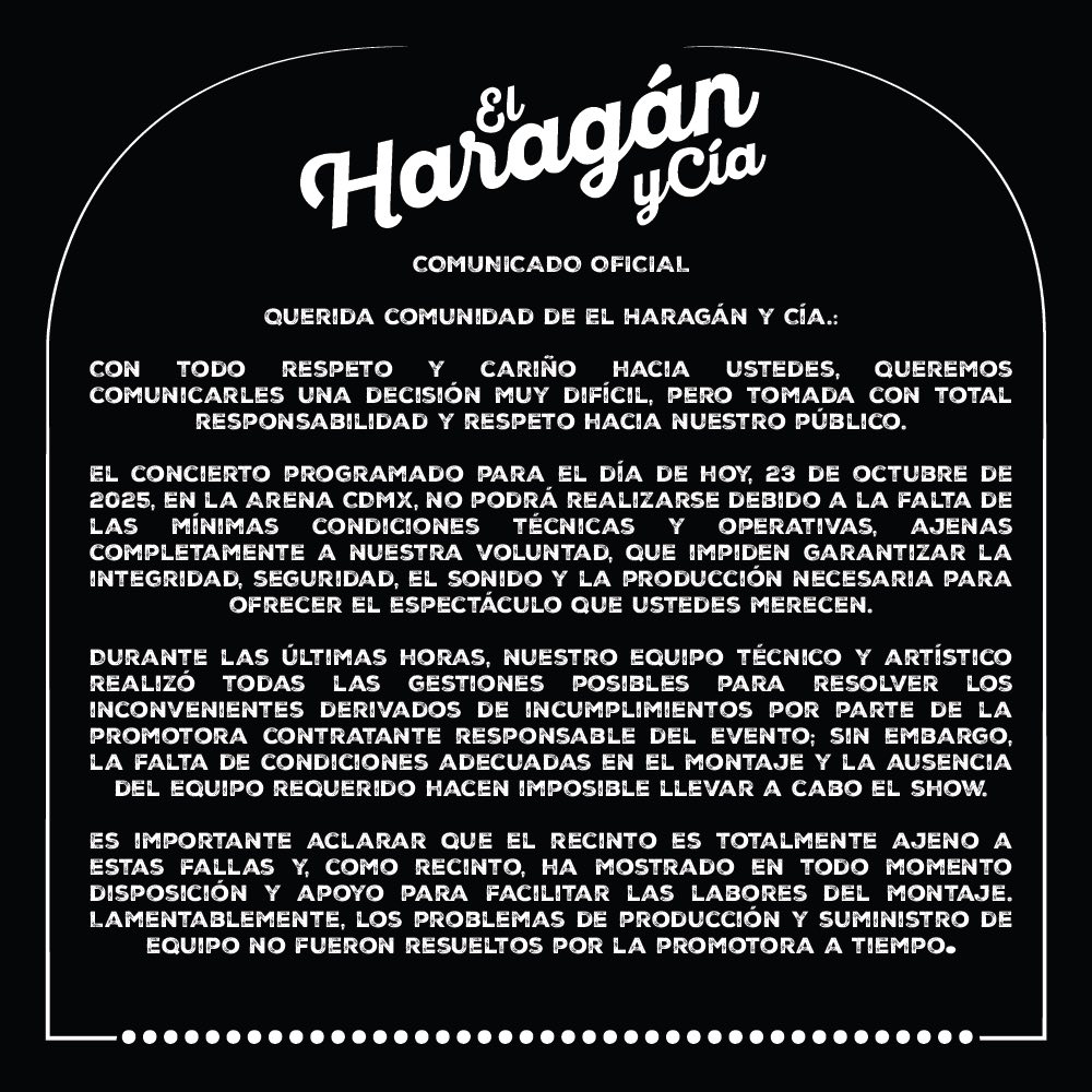 La noche que debía ser una celebración histórica para el rock mexicano terminó convertida en una afrenta. A sólo unas horas del inicio del concierto con el que El Haragán y Compañía conmemoraría sus 35 años de trayectoria en la Arena Ciudad de México, la presentación fue cancelada de manera abrupta debido a presuntas omisiones y negligencias atribuibles a la empresa promotora Bobo Producciones, responsable de la logística y producción del evento.